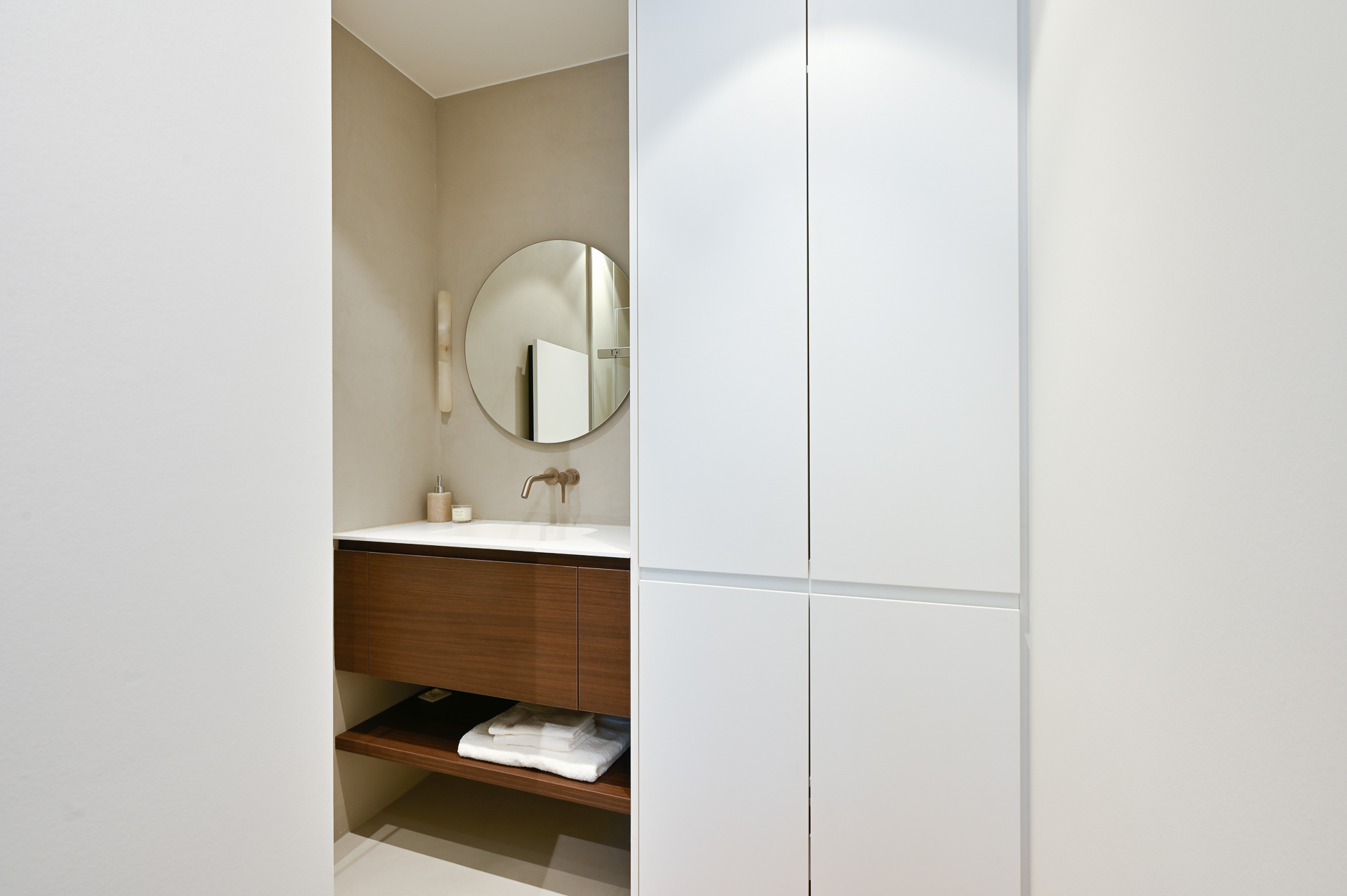 Een rode draad van hout en wit verbindt elke ruimte in dit appartement. De keuken, een meesterwerk van vakmanschap, is een oase van rust en functionaliteit. Het strakke, witte ontwerp wordt op een subtiele manier onderbroken door de warme, natuurlijke tinten van het hout. De opbergkasten, de rugwand en de decoratieve legbanken met geïntegreerde verlichting creëren een aangename en uitnodigende sfeer